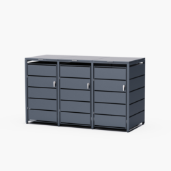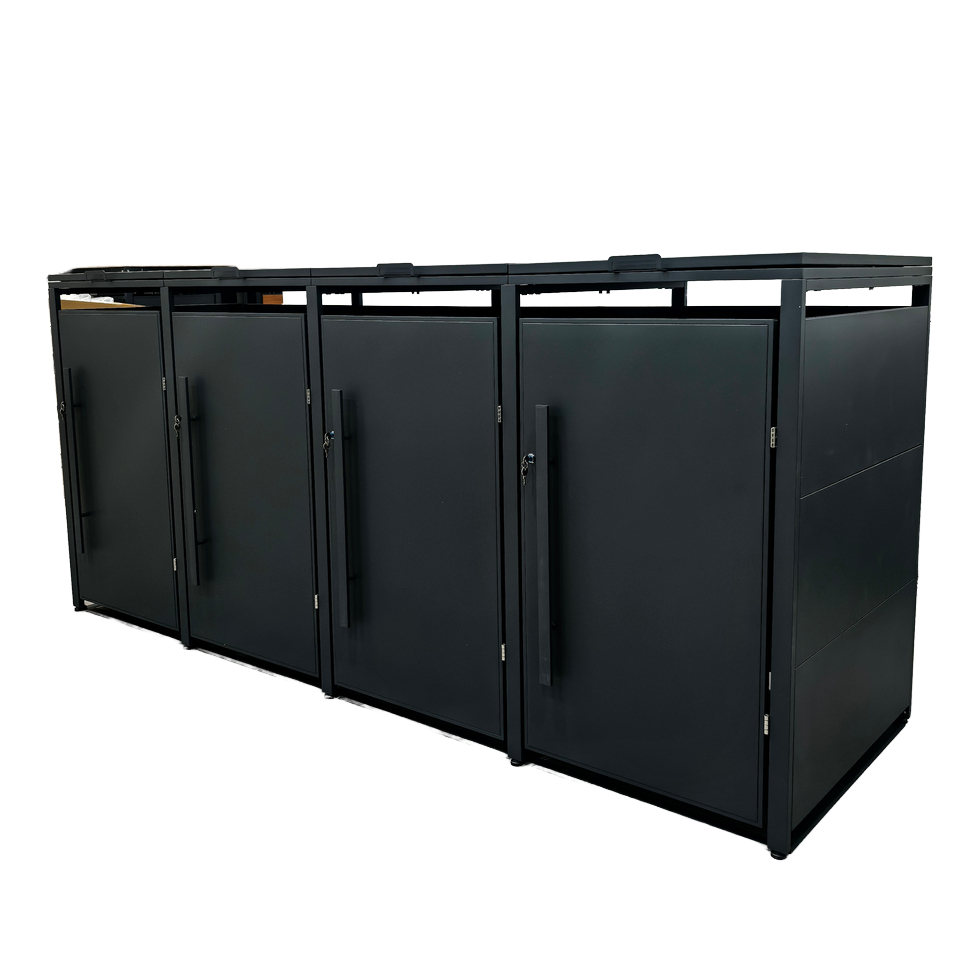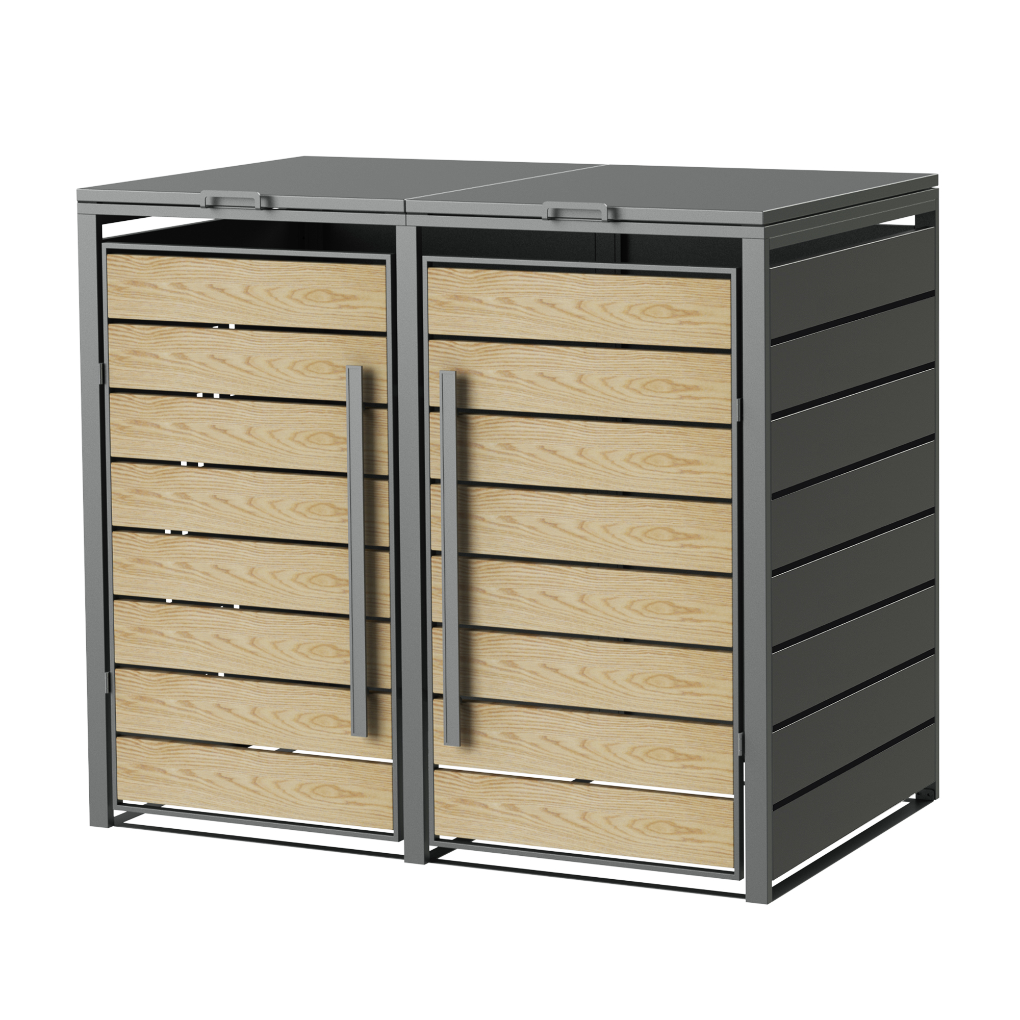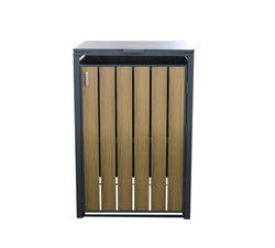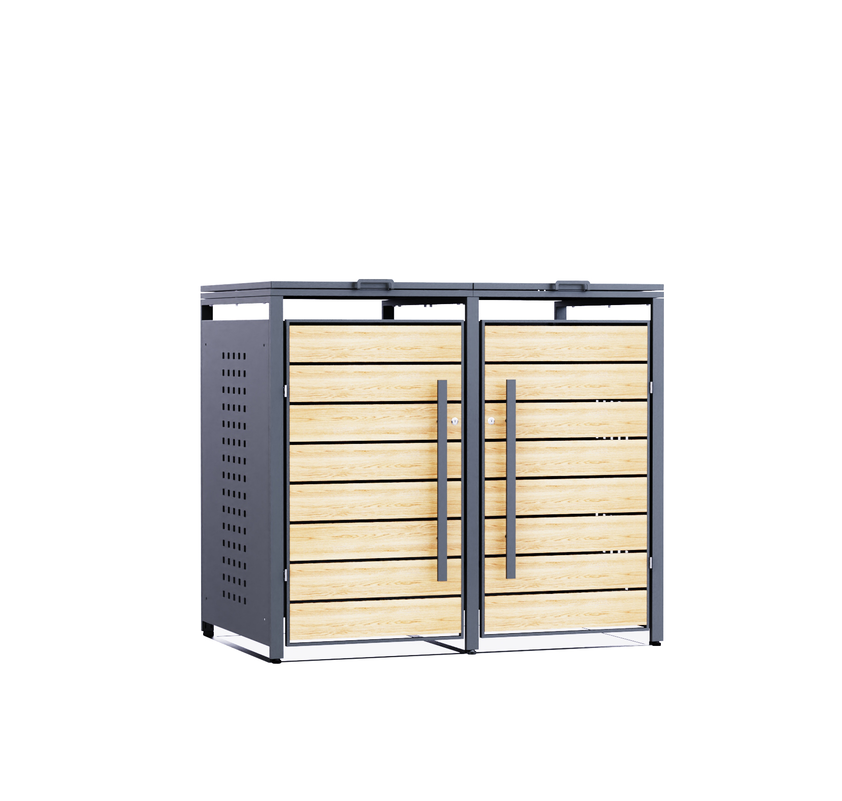 Classic and elegant design: Our wheelie bins hold two 120- to 240-liter bins and feature an attractive design that enhances the look of your driveway. High Quality: Made of high-quality galvanized steel, the bins are durable. The vents in the door ensure good ventilation, and the design is classic. They conceal and protect your wheelie bins in your garden, creating a clean and aesthetically pleasing environment. Practical: A long handle on the front door makes opening and closing the bin easy. A stainless steel chain also comes with it, allowing you to easily connect the wheelie bin lid to the lid of the bin box. When opened, both lids automatically open together. Convenient: Thanks to the gas spring in the bin lid, it opens almost automatically, allowing you to quickly and easily dispose of your waste with just one hand. The soft-closing damper ensures a nearly silent and secure lid closure. Advantages: You can easily connect as many wheelie bins as you want to create a larger bin. This not only ensures your bins stand firmly but also protects them from the elements – very practical for apartment dwellers or those who need to store multiple wheelie bins.